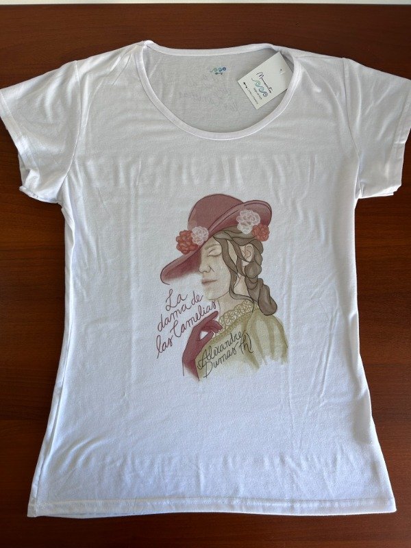 Una remera de modal color blanco con ilustración de La Dama de las Camelias en delantera y nombre de la autora en espalda (ver tabla de talles aparte)